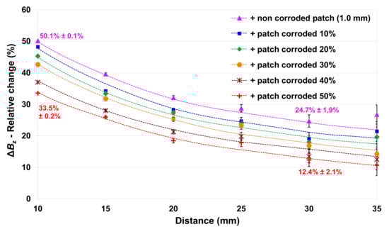For a distance of 30 mm, lower values of are obtained. In the case of the non-corroded and the 50%-corroded 1.0 mm-thick patches, their respective drop down to 24.7% and 12.4% (Figure 11), while the values measured from the 0.5 mm-thick patches are, respectively, 19.7% and 9.0% (Figure 12) but with uncertainties in the range ±2.0%. Indeed, due to the resolution of the Hall gaussmeter and the decrease in the mean values of with distance, the uncertainty rises up as well. This indicates a loss of accuracy with the increase in embedding depths for the monitoring of . We cannot discuss the results obtained from the measurements realized at 35 mm due to an even higher uncertainty increasing up to ±3.6%. These results also show that the thickness of the patch influences the FMM accuracy; this point is more deeply discussed in the Section 5.2.
