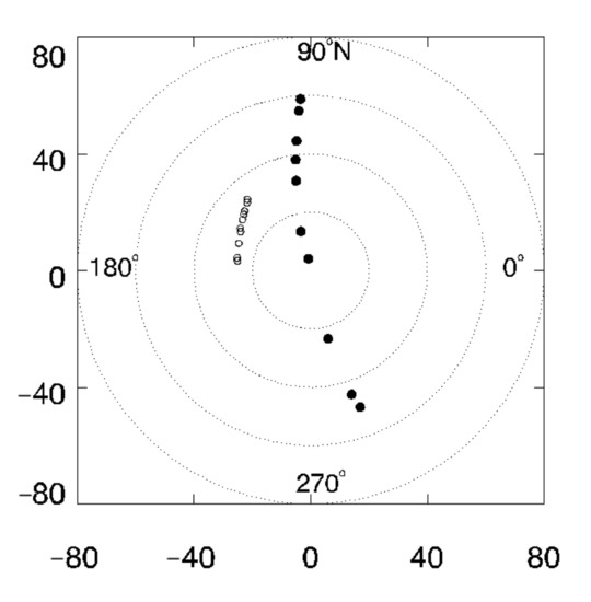Angular samplings of MODIS observations for a pixel during 162–177, 2010 in h20v11. The open and solid circles represent the sun and viewing locations. The radius represents the zenith angle with a 20° increment and the polar angle represents the azimuth angle.