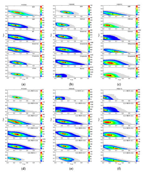 Figure 5 shows the scatter diagrams of F′vol and F′geo for different subsets. Because of the small number of LCTs and relatively stable range of NDVI in h18v07, the tile is not considered in this part. The pentacle represents the location of the FL or FN. Although the number of available pixels for the subset is reduced, these scatter diagrams of reflectance anisotropy in different subsets show an aggregated distribution pattern. In h12v04, the distribution pattern of reflectance anisotropy may be influenced by the number of pixels; however, the gathering center remains consistent for different subsets. In h20v05, the vegetated LCTs have a similar gathering center and the ENF has a relatively strong F′vol. The non-vegetated barren area, which usually has NDVI values less than 0.2, is more Lambertian, as the value of F′vol and F′geo is small. When the NDVI ranges from 0.2 to 0.7, the gathering center remains consistent. In h30v12, the gathering center of EBF and woody savannas is located in a F′vol-dominated area, while open shrubland has a weak F′vol. The other three LCTs have a similar distribution pattern. With an increase in NDVI, the gathering center gradually moves towards the F′vol dominated area. The ability of LCT and the NDVI to distinguish reflectance anisotropy is limited, and a visible difference only appears when there is a surface change from non-vegetated (Barren or NDVI < 0.2) to vegetated (NDVI > 0.2).