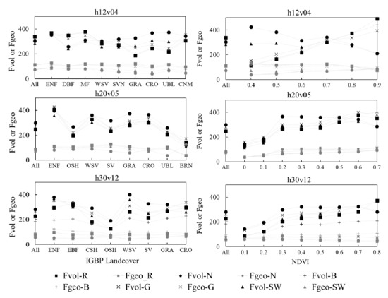 Figure 6 shows the values of F, FL, and FN that were extracted from the high-quality MODIS BRDF dataset or from the subset divided into LCT or NDVI in the three tiles. The values of FL and FN are extracted when the number of pixels in the subset is greater than 20,000. The variation regularity of FL and FN is not obvious. The woody, shrub, and herbaceous plants, which have obvious differences in structure, could even have a similar FL values. In the three tiles, the forest (ENF, MF, EBF) usually has a larger Fvol, while the barren and open shrubland usually have the smallest Fvol. The Fvol values in the near-infrared and shortwave broadband have a decreasing trend with the increase in NDVI, while the other bands have an increasing trend in h12v04. In h20v05 and h30v12, Fvol has an increasing trend when the NDVI is less than 0.3, but the momentum appears to wane when the NDVI is greater than 0.3. This may be because the surface structure of the two tiles is not as complex as in h12v04. The Fgeo is always small in the three tiles, and its change with NDVI and LCT is not significant.