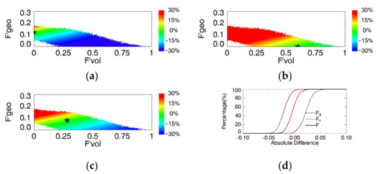 The Rd between the MODIS shortwave albedo and the albedo retrieved from the nadir reflectance using Fg (a), Fv (b), and F (c). The colors refer to the value of relative difference. (d) The distribution of accumulative Ad. The pentacle represents the location of F used in the albedo retrieval. The dashed, dotted, and solid lines in (d) refer to Fg, Fv, and F. The red lines refer to the Ad between −0.02 and 0.02.
