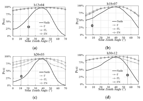P0.02 for nadir reflectance, F-, FL-, and FN-based albedo at various solar zenith angles. The sun symbol refers to the real solar zenith angle. (a–d) refer to the tile of h12v04, h18v07, h20v05 and h30v12.
