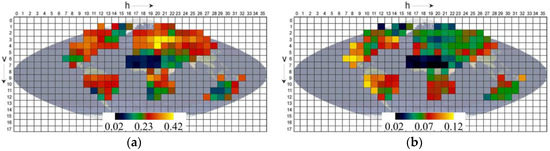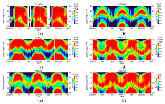 The spatial variations in reflectance anisotropy are analyzed based on global MODIS shortwave BRDF data on DOY 170, 2010. Figure 10a,b show the model parameters of F. For this period, the northern hemisphere and north-central part of South America usually has a relatively strong Fvol, and the maximum value appears in h20v03, h20v04, and h21v03; this is covered by dense crop, mixed forests, and grass. The relatively strong Fgeo appears around the Americas and the South Africa, and the maximum value appears on the west coast of the Americas, which are mainly covered by shrublands and savannas. For the desert regions in north Africa, the values of both Fvol and Fgeo are small.
