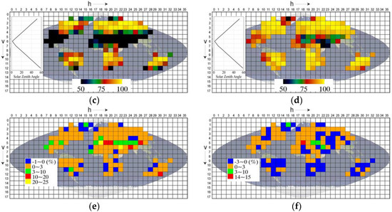 The global distribution of Fvol (a) and Fgeo (b) based on the high-quality MODIS BRDF data on DOY 170, 2010: (c,d) the global distribution of P0.02 based on nadir reflectance (c) and F-based albedo (d). The solar zenith angle at local solar noon for each row is also shown; (e,f) the difference between FL- and F-based P0.02 and the difference between FL- and FN-based P0.02.