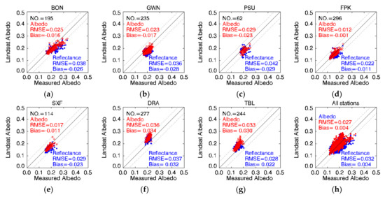 Comparison of Landsat shortwave albedo and reflectance with ground measurements at seven SURFRAD sites from 2000 to 2010: (a–g) the station of BON, GWN, PSN, FPK, SXF, DRA, and TBL, respectively; (h) result of all stations.