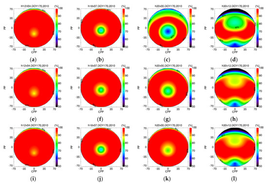 The P0.02 in any direction over the entire viewing hemisphere for h12v04, h20v08, h18v07, and h30v12 on DOY 170, 2010: (a–d) the F-based albedo; (e–h) the FN-based albedo; and (i–l) the FL-based albedo. The radius and the polar angle represent the zenith angle and the azimuth angle, respectively.
