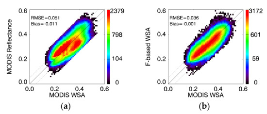 Comparison of MODIS WSA with real MODIS directional observation (a) and with F-based WSA (b) retrieval from a single directional reflectance. The colors represent the density of the directional reflectance.