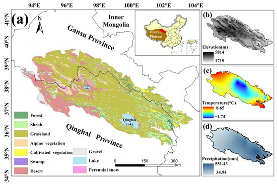 The QLMA lies at the intersection of the Tibetan, Mongolian and Loess plateaus (35.84°–39.97°N, 93.61°–103.90°E), with Qinghai Province in the south and Gansu Province of China in the north (Figure 2). The average elevation of the QLMA is over 3000 m, higher in the center and lower in the surroundings. This area belongs to the mid-latitude high elevation region. Most of the QLMA is in the temperate semiarid zone of the highlands [43], where solar radiation is strong. The average annual precipitation is 300–500 mm, more in the east than in the west. These make QLMA a sensitive area for climate change.