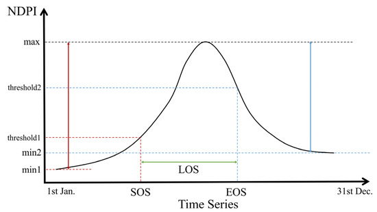 Schematic illustration for extracting LSP metrics using dynamics threshold method. The black curve represents the interannual NDPI for a given pixel. Red lines represent SOS, blue lines represent EOS and green lines represent LOS.