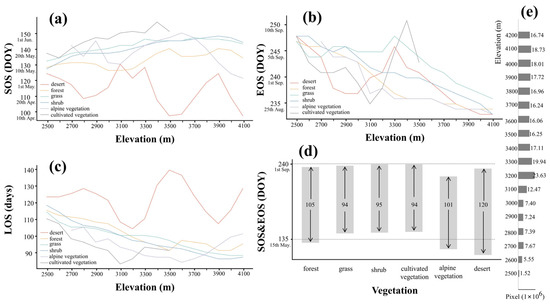 The calculated LSP metrics for the different vegetation types change with elevation. (a) represents the SOS, (b) represents the EOS and (c) represents the LOS. (d) shows the average of all elevations. The bar graph represents the average SOS and EOS of six different vegetation types, and the arrows inside the bar indicate their LOS. (e) shows the histogram of pixel numbers of different elevation gradients.