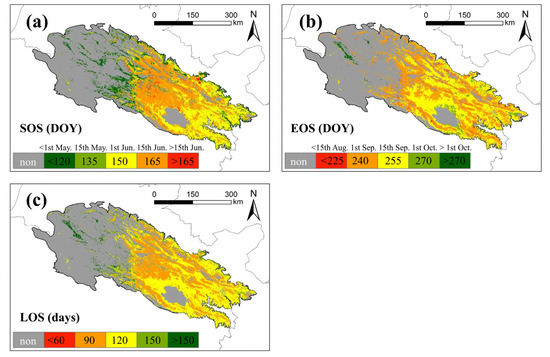 The spatial pattern of the mean values of land surface phenology metrics in the QLMA area is shown in Figure 7. Many western areas were filtered out because of the lack of seasonal vegetation. The earliest start of the growing season is in the western and northern margins, usually before 1st May, followed by the eastern areas, where the growing season starts within about a month (before 1st June). Vegetation in the central part of the study area has the latest start of the growing season, occurring after 1st June, and in a few areas even later (after 15th June) (Figure 7a). The growing season for most of the vegetation in the study area ends between 15th August and 15th September. Growing seasons in the northern part of Qinghai Lake and the eastern edge of the study area end half a month later. The vegetation with the latest end of the growing season is located in the western region, occurring after 1st October (Figure 7b). The spatial distribution pattern of LOS is similar to that of SOS, with the northern edge and the sporadic areas in west having the longest vegetation growing season, which exceeds 150 d at most. From the eastern area toward the center, the vegetation growing season gradually shortens from up to 120 d to up to 90 d (Figure 7c).