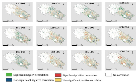 The proportion of significant positive and significant negative correlations indicates the main direction of influence of snow seasonality metrics on LSP metrics (Table 1). All the 12 correlations have a relatively obvious directionality, meaning that there is no positive correlation with the same proportion of negative correlations. Among them, positive correlations dominate in FSD_SOS, LSE_EOS, LSD_LOS, SSL_L0S and SCD_LOS. The proportion of insignificant positive correlations is about 7% more than the proportion of insignificant negative correlations, and the proportion of significant positive correlations exceeds the proportion of significant negative correlations by twice. However, negative correlation is the major of FSD_LOS, SSL_SOS and SCD_SOS. The proportion of insignificant positive correlations is approximately 6% less than the proportion of insignificant negative correlations, and the proportion of significant positive correlations is less than half of the proportion of significant negative correlations.