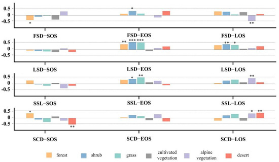 To characterize differences in the responses of land surface phenology to snow seasonality, we compared the responses of six vegetation phenological characteristics to snow (Figure 10). The elevation interval with the highest concentration of vegetation distribution is selected: 2600–3500 m for forest and cultivated vegetation, 3100–4000 m for grass, shrub and desert, and 3600–4200 m for alpine vegetation. FSD is significantly negatively correlated with SOS of forest and LOS of alpine vegetation, and significantly negatively correlated with EOS of shrub. EOS of forest, shrub and grass is significantly positively correlated with LSD, as is LOS of shrub and grass. SSL and SCD affect vegetation in almost the same direction. SSL is significantly correlated with EOS for more vegetation types, while SCD is significantly correlated with SOS and LOS of vegetation. The SOS of forest is significantly positively correlated with SCD, while the SOS of desert is significantly negatively correlated with SCD. EOS of shrub and grassland is more sensitive to SSL and is significantly positively correlated. LOS of alpine vegetation is significantly positively correlated with both SSL and SCD, while LOS of desert is significantly positively correlated with SCD only.