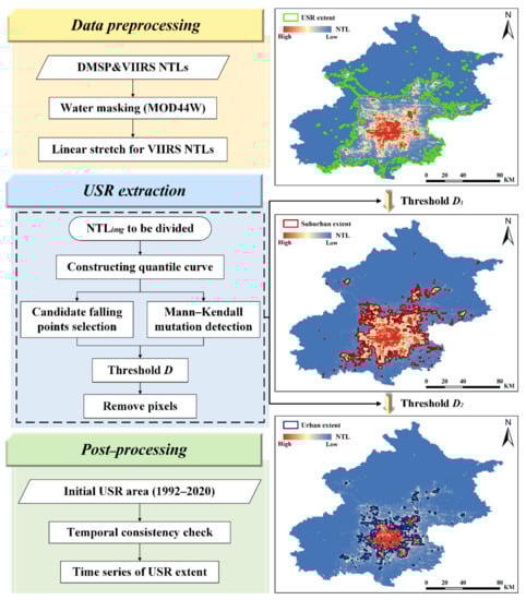 In this paper, we define the three subcategories of USR based on the variations of NTL intensity as the NTL intensity is positively correlated with human activity intensity. To achieve rapid and semiautomatic extraction of USR, an improved method was developed for iteratively determining the specific values of each subcategory of USR, which was proven to be effective for both DMSP/OLS and VIIRS-NPP data. First, to eliminate the discontinuity between two sets of NTL data from different sensors, the VIIRS-NPP data were enhanced by a maximum–minimum (0–63) piecewise linear stretch to match the value ranges of the DMSP/OLS data. Second, a multiple iteration approach based on the combination of the NTL gradient and the Mann–Kendall-inspired algorithm was used to progressively extract the annual USR extent in the study area from 1992 to 2020. Finally, a temporal consistency check was applied to the USR extent obtained from the second step for deriving more consistent and reasonable USR dynamics. Figure 1 shows the general flow chart for retrieving the extent of the three USR subcategories. More details of each step can be found in the following.