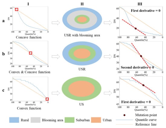 and represent the DN values of two neighboring points in the quantile curve. The number of the points in one quantile curve is . The operator “” is the antonomasia of calculating average value; The operator “” is the antonomasia of calculating variance. The forward sequence was computed by the formulas listed above with the input DN values ranking according to the percentile from 0 to 100, while the inverse sequence was computed in the same way using the inverse DN values ranking according to the percentile from 100 to 0 as input. The mutation point of the original data was obtained by finding the intersection point of the forward and inverse sequences on the same abscissa. Figure 3 shows the three types of constructed quantile curves (column I), the specific USR structures corresponding to each quantile curve (column II), and the mutation points calculated by the Mann–Kendall-inspired algorithm (column III). When the quantile curve is regarded as a concave function (Figure 3(aⅠ)), it refers to the USR structure with blooming area (Figure 3(aⅡ)) and the point with the first derivative is zero on the quantile curve which is detected as the mutation point (Figure 3(aⅢ)); when the quantile curve is regarded as a combination of a convex function and a concave function (Figure 3(bⅠ)), it refers to the USR triad structure (Figure 3(bⅡ)) and the point with the second derivative is zero on the quantile curve is detected as the mutation point (Figure 3(bⅢ)); when the quantile curve is regarded as a convex function (Figure 3(cⅠ)), it refers to the urban core–suburban (US) structure (Figure 3(cⅡ)) and the point with the first derivative is zero on the quantile curve is detected as the mutation point (Figure 3(cⅢ)).