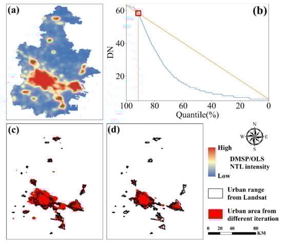A schematic diagram of the third iteration for USR extraction. (a) A sample DMSP NTL image in Tianjin. (b) The first quantile curve conducted based on the image with the quantile value of the intersection point higher than 70%. (c) Extracted urban area from the second iteration. (d) Extracted urban area from the third iteration.