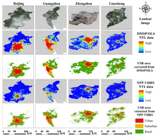 Furthermore, we compared the USR results from two different NTL datasets (Table 3). The VIIRS result is more detailed because of its higher spatial resolution and small blooming effect. The four sample cities in Figure 5 show that the VIIRS dataset detected scattered urban areas around the core, which was missed by DMSP. Owing to the coarse resolution and the blooming effect, the DMSP dataset overestimated rural areas by polymerizing the transitional zones around several densely populated areas, which leads the area from VIIRS to be smaller than that from DMSP. However, the median deviation and average deviation between the urban and suburban results from DMSP and VIIRS were approximately 20%, and Pearson’s R reached 0.8, indicating the correlation between the urban and suburban results from DMSP and VIIRS. Notably, the median deviation and average deviation between the rural results from DMSP and VIIRS were reasonably high, as the rural areas with the dimmest night light were worst affected by the difference in spatial resolution between the DMSP and VIIRS NTL datasets. The inconsistency of the rural areas from different NTL datasets was caused by the coarse resolution and the blooming effect of DMSP/OLS. Overall, the comparison between the urban and suburban results from different NTL datasets shows a generally acceptable correlation.