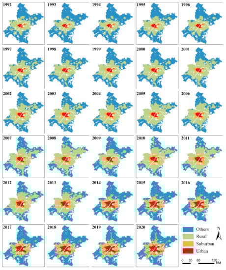 Urbanization, including the development of high-density cities as well as suburban sprawl and the expansion of exurban areas at the urban–rural fringe, is a dominant driver of land change across the globe []. Associated with land use/cover change, urbanization is widely recognized as an important factor in resource scarcity [], public health [], environmental degradation [], energy consumption [,], climate change [,], etc. As the most populous country in the world, China has experienced rapid urbanization since its economic reforms started in 1978. For instance, the urbanization level of China increased from 17.9% in 1978 to 60.6% in 2019 [,]. Uncontrolled urban sprawl caused by rapid urbanization promotes the interaction between urban areas and urban boundaries (suburban or rural areas) and consequently leads to adverse land use conflicts at the three interfaces of the “urban core-suburban-rural” (USR) triad structure [,]. As such, in addition to mapping urban areas alone, long-term and consistent mapping of the three subcategories of USR areas is essential to track, understand, and simulate the interaction of urban–suburban–rural areas, pathways of urbanization, and their corresponding impact on landscape fragmentation, environmental degradation, and even sharp social contradictions [].