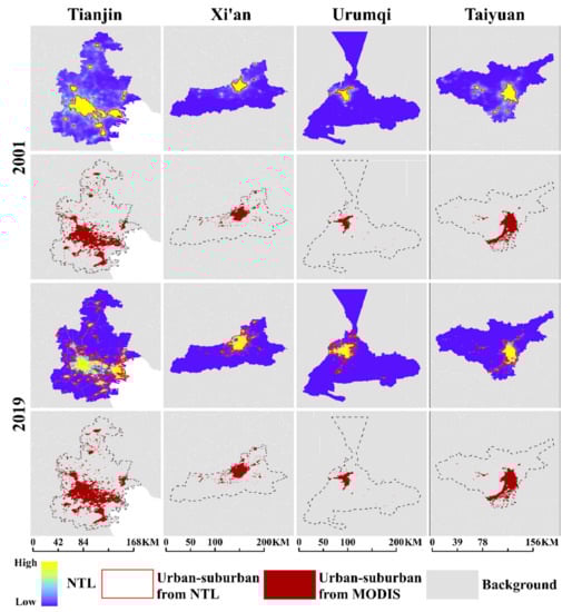 Examples of the urban core and suburban areas extracted from the DMSP imagery (2001) and VIIRS imagery (2019).