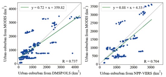 Comparisons of urban–suburban areas from NTL and MODIS. The blue dots represent the comparisons of urban–suburban areas from DMSP and MODIS spanning 2001–2013, and VIIRS and MODIS spanning 2012–2019.