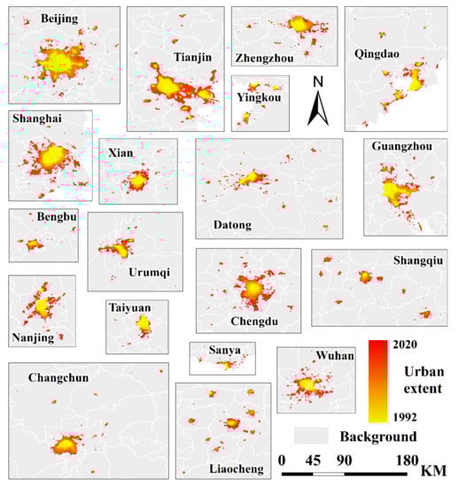 The time series DMSP NTL images acquired by different sensors lack time continuity due to the influence of many external factors, such as satellite orbit drift, along with the fact that the satellite sensors are not corrected by satellite radiometric correction. This will affect the identification of the DMSP NTL distribution and the number of iterations for USR extraction. Therefore, we first applied temporal filtering with a window size of 7 to revise the number of iterations for USR extraction for each city based on DMSP NTL imagery. Then, a temporal consistency check and logical reasoning modification based on the irreversibility of the urbanization process were employed for each pixel in both the DMSP and VIIRS USR ranges to obtain a more reliable USR-extent sequence with less temporal inconsistency from 1992 to 2020. A detailed description of the method can be found in Li et al. (2015).