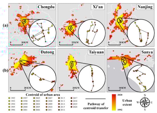 Obvious urbanization processes can be observed through the superposition of the urban areas retrieved from NTL data with diverse spatial patterns because of the different levels of socioeconomic development from 1992 to 2020. As shown in Figure 9, all the study cities have experienced notable urban expansion in recent decades with size, rate, and direction varying remarkably among different cities. Analyzing the expansion size of the cities, the three supercities (Beijing, Tianjin, and Shanghai) present a reasonable and noticeable urban growth with the top three increased areas, which are 1476 km2, 1479 km2, and 1275 km2, respectively. One of the large cities (Liaocheng) and one of the medium-sized cities (Shangqiu) have undergone the most numerous urban expansions compared to their urban areas in 1992, which attained growth rates of an urban expansion reaching 36 and 18, respectively. In addition, the directions of urban expansion also mark the difference in the urbanization process among different cities. This can be generally divided into two types: radiating outward from the center (type A) and radiating in a single direction (type B). For instance, the urban expansion occurring in Chengdu, Xi’an, and Nanjing displays a trend of expanding radially from the center outward, while the urban expansion of Datong, Taiyuan, and Sanya shows the tendency of expanding in a single direction, such as east, south, and north (Figure 10). This might be due to topographic factors.