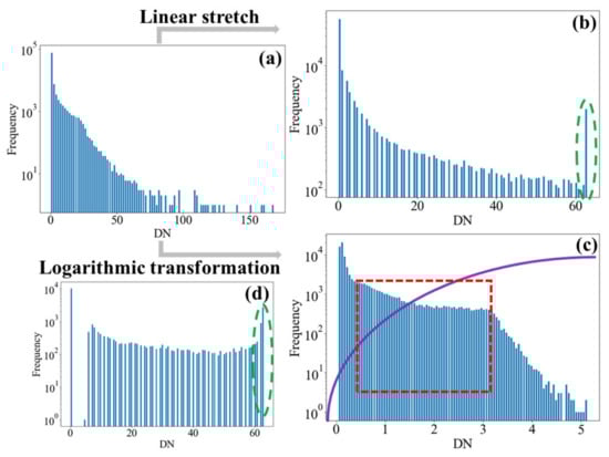Comparison of the VIIRS variation after linear stretch (b) and the VIIRS variation after logarithmic transformation (c). (a) Histogram of the original VIIRS data. (d) Histogram of the original DMSP data.