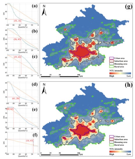 The Mann–Kendall-based mutation point algorithm in this study is precise with mathematical implications. It consists of searching for the point at which the first or the second derivative is zero in the quantile curve according to different situations (Figure 3). Figure 13 shows the comparisons of extracted USR extent in Beijing with the quantile approach improved by Huang et al. to retrieve the extent of USR subcategories from NTL images, which just calculates the point on the quantile curve located farthest from the reference line []. Figure 13a–c are the threshold values of blooming, suburban, and urban areas using the Mann–Kendall-based mutation point algorithm, respectively, and Figure 13g displays the corresponding USR results. Meanwhile, Figure 13d–f are the threshold values of blooming, suburban, and urban areas based on the quantile approach, respectively, and Figure 13h displays the corresponding USR results. The quantile approach separating the USR subcategories based on the point on the quantile curve located farthest from the reference line can capture the point with the first derivative being zero when the patterns of NTL variations are the same as (d) or (f). However, it failed to identify the accurate mutation point regarding situations such as (e), as the retrieved suburban area was nearly the same as the retrieved urban area (Figure 13h), while the Mann–Kendall-based algorithm proposed in this paper succeeded in calculating the point with the second derivative of zero in the same situation (Figure 13b) and thus delineated the correct extent of the suburban area (Figure 13g).