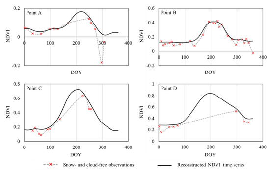 The original snow- and cloud-free Landsat observations (red cross) and the reconstructed Landsat NDVI time-series data at four locations (the locations are shown in Figure 3A).