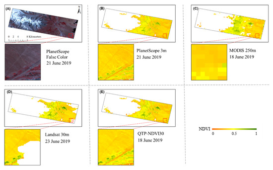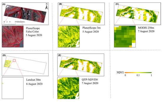 Comparisons of the spatial patterns of the PlanetScope NDVI (3 m), MODIS NDVI (250 m), original Landsat NDVI (30 m), and QTP-NDVI30 (30 m) in the A-5 area.