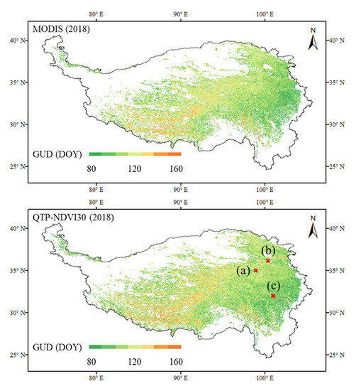 In the third experiment, we explored an application of QTP-NDVI30 to determine the vegetation green-up date (GUD) over the QTP. The GUD was estimated according to Zhang’s logistic method [35], and was determined to be the date showing an initial maximum value of the rate of change in the curvature of the fitted NDVI curve. We compared the QTP-NDVI30-derived GUD with the MODIS-derived GUD through visual assessments and expected richer spatial information in the QTP-NDVI30-derived GUD.