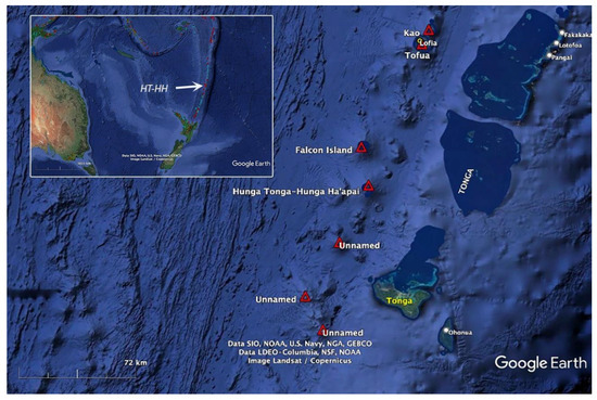 Study area with a zoom of the Hunga Tonga–Hunga Ha’apai (HT-HH) volcanic region. The Tonga–Kermadec trench lies to the east of the volcanic Tofua arc where several submarine volcanoes are shown in red triangles. Source: Google Earth.