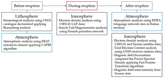 Here we propose a complete study of the great explosive eruption of 2022 investigating the phenomenon from multi-parametric and multi-layer data. We start to present the precursors in seismological and atmospheric data that could be connected to the incipient eruption. Then, we analyse the effects of the propagation of a pressure wave in the atmosphere registered from the Italian tide gauge network. Extending our study area to the ionosphere, we present a specific analysis of the geomagnetic field from satellite data, showing peculiar precursory signals. We also present the limit of this layer study due to the geomagnetic storm in the “recovery” phase and finally we show a singular signal detected on the spectrograms from the Finnish pulsation magnetometer network. The flowchart of our analysis is shown in Figure 2. Among all the studies about this eruption, our analysis is one of the more complete considering different aspects and different temporal and spatial scales. The results obtained confirm the coupling between the lithosphere, atmosphere, and ionosphere for this volcanic event.