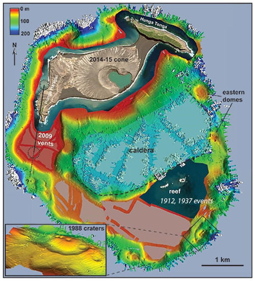 The volcanic edifice rises from the seafloor to above sea level, and it is visible at the surface as two small andesitic islands, Hunga Tonga and Hunga Ha’apai, made up of a succession of ignimbrites and andesitic lava flows, representing the remnants of the north-western rim of a largely submarine caldera, around 1800 m high and 20 km wide, located about 30 km SSE of Falcon Island (Figure 3). It belongs to the Tonga–Kermadec volcanic arc, part of the “Ring of Fire”. A Surtseyan eruption observed near 20.5°S and 175.4°W on 19 December 2014 combined them into one larger structure [2,31]. Previous eruptions are proved by additional welded pumice-rich ignimbrite units and non-welded pyroclastic flow deposits, below paleosols and other volcanoclastic deposits. Cronin et al. [32] using a WASSP multibeam sounder obtained a map of the entire submarine caldera and the summit platform of the submerged Hunga volcanic edifice of recent formation. The caldera appeared as a large, closed depression, around 150 m deep, probably formed by a violent collapse of the older Hunga edifice into the sea by an unknown eruption. The rim of this caldera is surrounded by numerous cones formed in previous eruptions. The floor of the caldera has been quiescent since there is information. All known eruptions in the last decades occurred around the rim of the caldera and some resulting vents and reefs were still visible from the bathymetry (Figure 3). In addition, the emerged cone, formed after the 2014–2015 eruptive activity and connecting the two islets, is located on the NW rim of the caldera.
