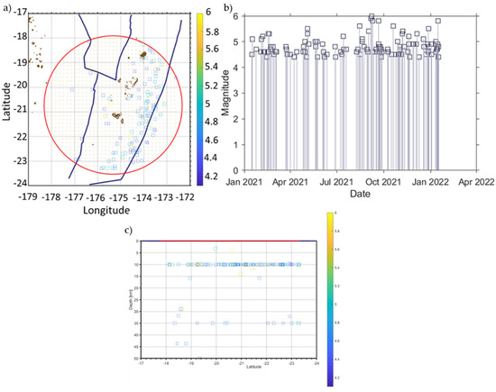 Starting from the lithospheric point of view, we carried out a seismological analysis of the volcanic region in the subduction zone. Considering the magnitude M5.8, attributed to the volcanic event by the United States Geological Survey (USGS), we use the USGS catalogue in the period between 1 January 2021 and 16 January 2022. Taking into account the zone of effective manifestation of the precursory deformations as defined by the Dobrovolsky area [33] with a radius R = 100.43M = 312 km, we selected 388 events and obtained the first map of Nuku’alofa—the capital of Tonga—seismicity. We proceeded to calculate a cumulative trend of the events with a magnitude equal to or larger than Mc = 4.3 (Mc indicates the magnitude of completeness), computed as a function of time by sliding the time windows, each containing 150 earthquakes and stepping by 5 events.