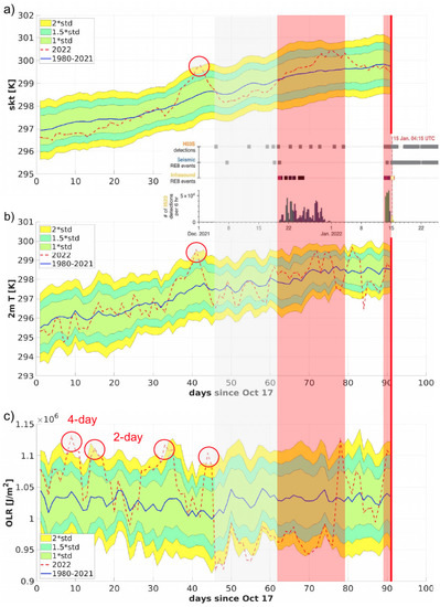 Case study for 2022 Hunga Tonga volcanic eruption ECMWF (a) SKT, (b) T2m, (c) OLR. The comparison between the 2022 time series (dashed red line) and the historical time series (1980–2021, blue line) is shown. For the latter, we also represented the 1.0 (cyan), 1.5 (green) and 2.0 (yellow) standard deviations from the mean, respectively. The circle puts in evidence the identified anomalies. The eruption occurred at the end of the analyzed period (90 days) as indicated by the red vertical line. Red shaded areas highlight periods of eruptive activity as also detected remotely by the analysis of co-eruptive seismic, hydroacoustic, and infrasound signals since December 2021 (modified from [14]). Reprinted with permission from AAAS. The grey shaded area instead highlights a period of pre-eruptive seismic and hydroacoustic detections.