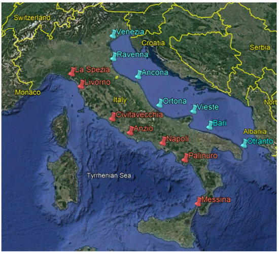 The data used for this analysis come from ISPRA’s (Italian Institute for Environmental Protection and Research) National Tidegauge Network (https://www.mareografico.it/?syslng=ing, accessed on 15 June 2022), consisting of 36 environmental monitoring stations located along the Italian coasts. Since the wave came from approximately the north direction, we considered stations at different latitudes (Figure 8).