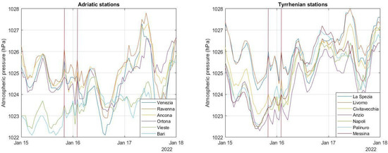 Considering that the effects of this volcanic event on atmospheric parameters were distributed over the whole globe, we also performed a meteorological analysis in Italian territory. We calculated the HT-HH—Italy (20.57°S, 175.38°W; 42°N 12°E respective coordinates) shortest distance from the website by Movable Type Ltd. (https://www.movable-type.co.uk, accessed on 15 June 2022) that is 17,530 km. Since the pressure wave is the parameter that mainly influenced on the meteorological effects of the volcanic event, and such effects travel at the speed of sound, depending on the temperature, we calculated this speed coherent to the 0–10 °C—winter temperature in which the wave passed in Northern Hemisphere—and the value is 1195 km/h. It means that they arrived in Italy at around 20:00 UTC on 15 January 2022. We further calculated a second arrival of the signal, at 6:00 UTC on 17 January.