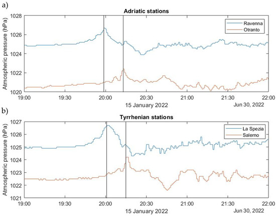 To better appreciate the late arrival of the pressure wave from north to south stations, we examined the same parameters data sampled every 15 s and downloaded from ISPRA’s TAD Server (https://tsunami.isprambiente.it/Tad_Server, accessed on 15 June 2022). The better temporal resolution allowed us to distinguish the temporal delay—between 20 UTC and 20:15 UTC—of the pressure wave in stations at different latitudes and longitudes, again separating the Tyrrhenian (Figure 10a) and Adriatic stations (Figure 10b). Furthermore, we can see the pressure wave arrived before on the Adriatic coast and minutes later on the Tyrrhenian side, confirming its northeast direction.