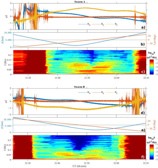 Differentiated magnetic data from Swarm A and B (panels (a,d)) during 15 January 2022, together with the satellite-volcano distance ‘d’ and the satellite geographic latitude ‘λ’ (panels (b,e)) and sum of the PSD of all components, here indicated with S (panels (c,f)). The large high power intervals at high latitudes (|λ| > 55–60°) are due to polar phenomena.