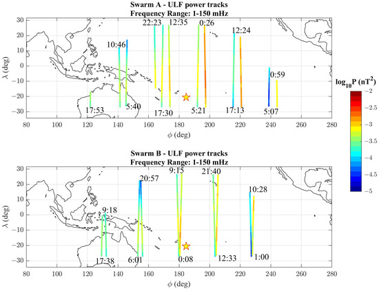Power tracks in the 1–150 mHz ULF range at Swarm A (top) and B (bottom) during 15 January 2022. The local times of the track beginning are indicated. Both satellites show power tracks with higher values in a large region around the volcano, almost independently of the local time. The volcano position is marked by a star.