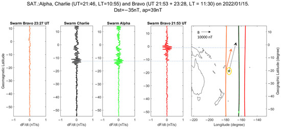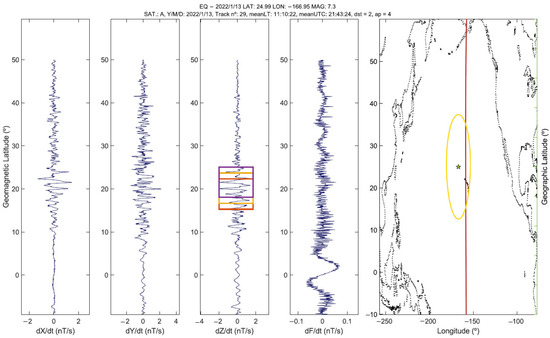 Further, we analyzed the Swarm tracks passing in a Dobrovolsky area of M7.3—we considered a major magnitude with respect to the one attributed to the eruption since the energy released in the atmosphere is bigger than the energy released at the surface (as described in [7] and more detailed [14]) over the conjugate magnetic point of the volcano eruption. In this case, we examined the magnetic field components and the total intensity F recorded with a sampling frequency of 1 Hz. Here, we follow the MASS method (ref. [49] for more details about the method). According to the above-shown investigations, all-time series were differentiated. In the tracks of all satellites on 13 January, there was an interesting signal. We report Swarm A as an example in Figure 13.