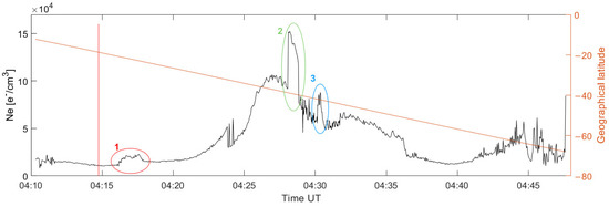 At this time, we were able to analyse the Langmuir probe (LAP) data—inherent to the electron density in the ionosphere in situ—from the CSES-01 satellite relative to the day before and the same day of the volcanic event. On the day before, we saw in different tracks close to the equator a common disturbance that, due to its shape and recurrence, we propose as an instrumental or cross-talk: probably it could be due to an interference with the rotation of the solar panel conducted about the equator to optimize the solar irradiation on the same panel. For further analysis, we plotted the electron density during the time of the explosion of the Hunga Tonga volcano, shown in Figure 15.