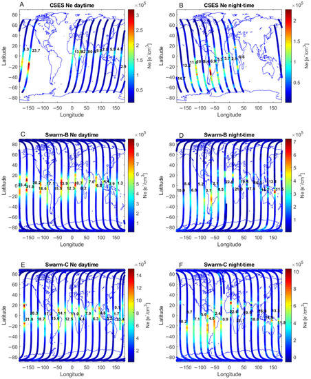 CSES-01 Ne maps are divided for day and nighttime (left and right, respectively), the UTC time is represented near the track. (A,B) CSES-01; (C,D) Swarm B; (E,F) Swarm C tracks.