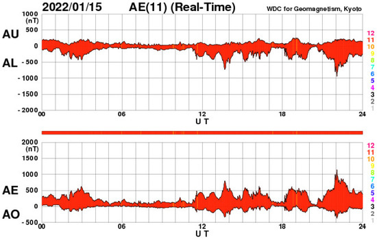 Auroras Electrojet (AE) index distribution on 15 January 2022, day of major Hunga Tonga volcanic eruption.