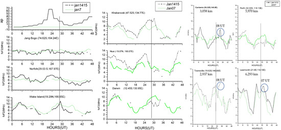 Using the global ionosonde network (see Table 1 for more information about the ionosonde observatories considered), we analyzed the parameter foF2, defined as the highest frequency at which the ionosphere reflects vertically. foF2 increases at 05 UTC but the same effect is seen on the previous day, so we cannot consider it connected to the volcanic activity (Figure 19).
