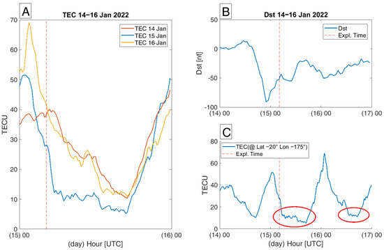 Total electron content (TEC) data from 14 to 16 January 2022. In (A) there is the comparison of the three TEC time series as a function of the hour of the day (UTC): it is evident the lowering of the TEC values on the eruption day (15 January) compared to the previous and following days; (B,C) show the simultaneous behaviour of the Dst and the TEC time series.