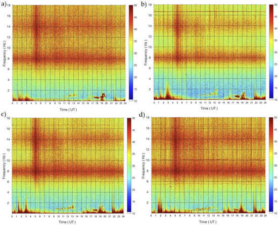 Spectrograms of 15 January 2022 revealed by the search coil magnetometers of the Finnish stations: (a) Nurmijärvi, (b) Oulu, (c) Sodankylä, (d) Kevo.