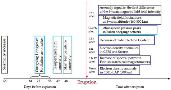The timeline of all anomalies detected before and after the great eruption is shown in Figure 22, representing a chronological summary of the found anomalies in the different geolayers and demonstrating that, not only the consequences of the eruption were affecting the entire globe, but also its preparation involved a very large area, much larger than the local volcanic cone.