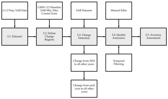 This study builds on the 2010 global mangrove baseline map, GMW v2.5, Bunting et al. [29], in which L-band SAR data from the JERS-1 (1996), ALOS (2007–2010), and ALOS-2 (2015–) missions of the Japan Aerospace Exploration Agency (JAXA) were used to perform change detection from the 2010 baseline to generate mangrove extent maps for the years 1996, 2007, 2008, 2009, 2010, 2015, 2016, 2017, 2018, 2019 and 2020. The analysis was undertaken on the SuperComputing Wales (SCW) High-Performance Computing (HPC) infrastructure using the Remote Sensing and GIS Library (RSGISLib) of tools [31], the KEA image format [32] and the pbprocesstools [33] workload library to manage the workflow of tasks on the HPC. The overall workflow is illustrated in Figure 1 and detailed below.